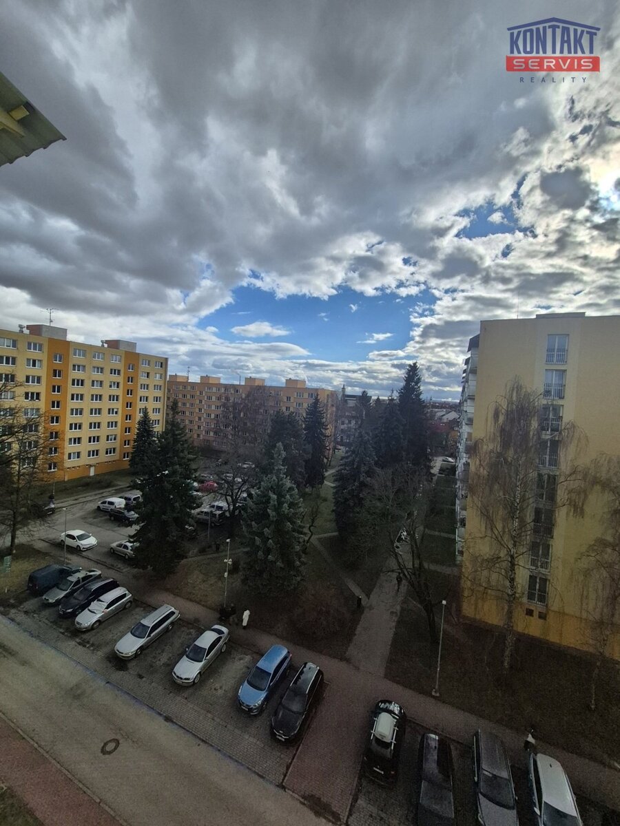 Okno je orientováno směrem na Pekárenskou ulici s výhledem do parku a na